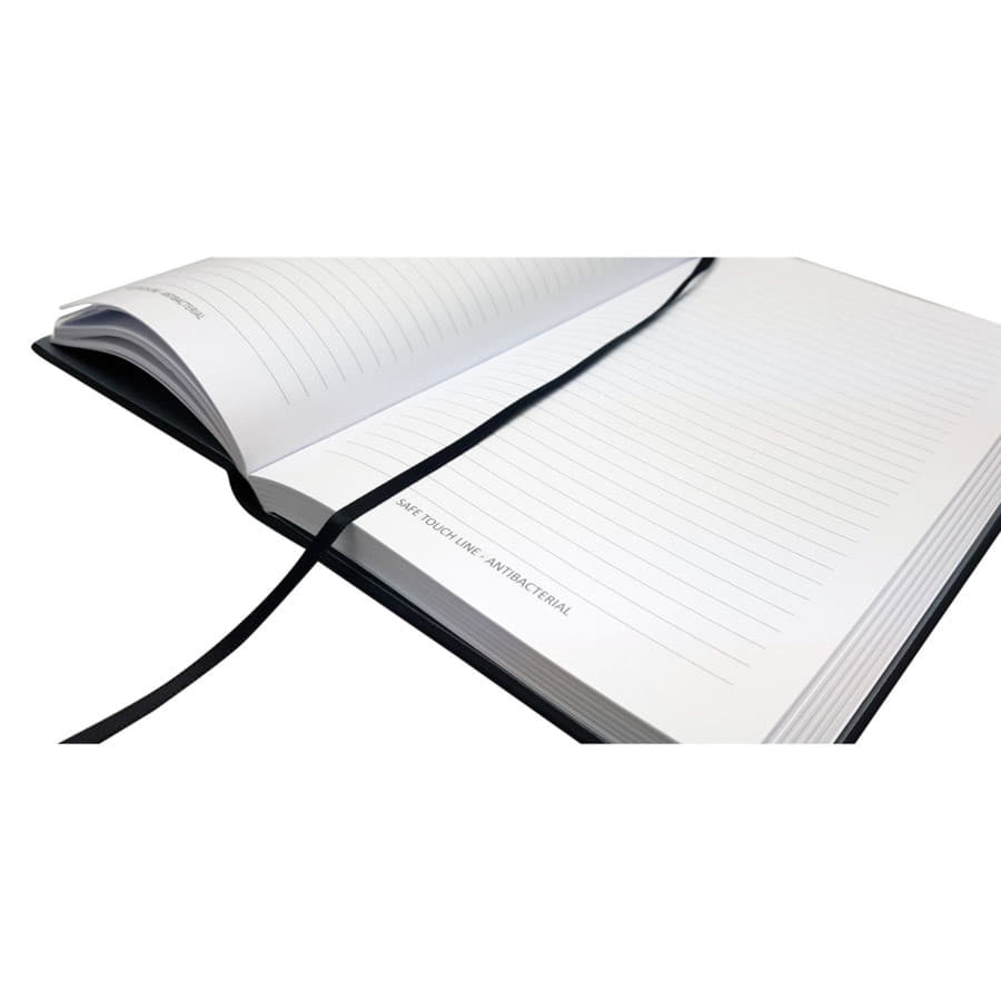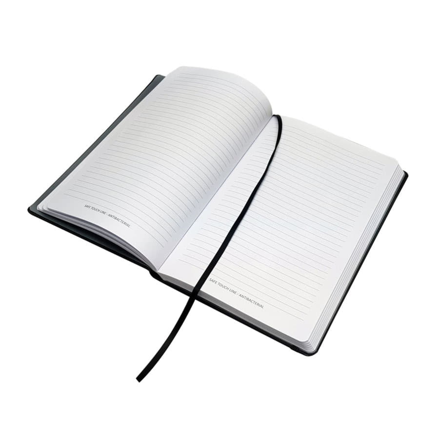 Блокнот PRIME SAFE TOUCH, А5, 100% антибактериальный, черный Первый на рынке 100% антибактериальный блокнот бренда Enote Разработан и произведен в Европе Не только материал обложки с антибактериальным покрытием BIOMASTER (Великобритания), но и польская бумага внутреннего блока также с антибактериальной добавкой BIOMASTER AT300 Антибактериальный эффект подтвержден тестами в соответствии со стандартами ISO 22196: 2011 и ISO 20743_2013 Твердый переплет Обложка из soft-touch кожзама (Италия) Серые форзац нахзац Блок в линейку 256 страниц Бумага FSC белая 70 г м2