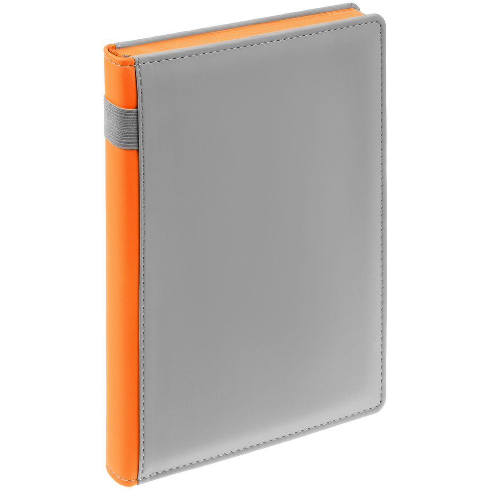 Твердая обложка с поролоном, материал обложки — Soft Touch, серый СС и Soft Touch, оранжевый ОО. На корешке ежедневника находится петля из резинки.