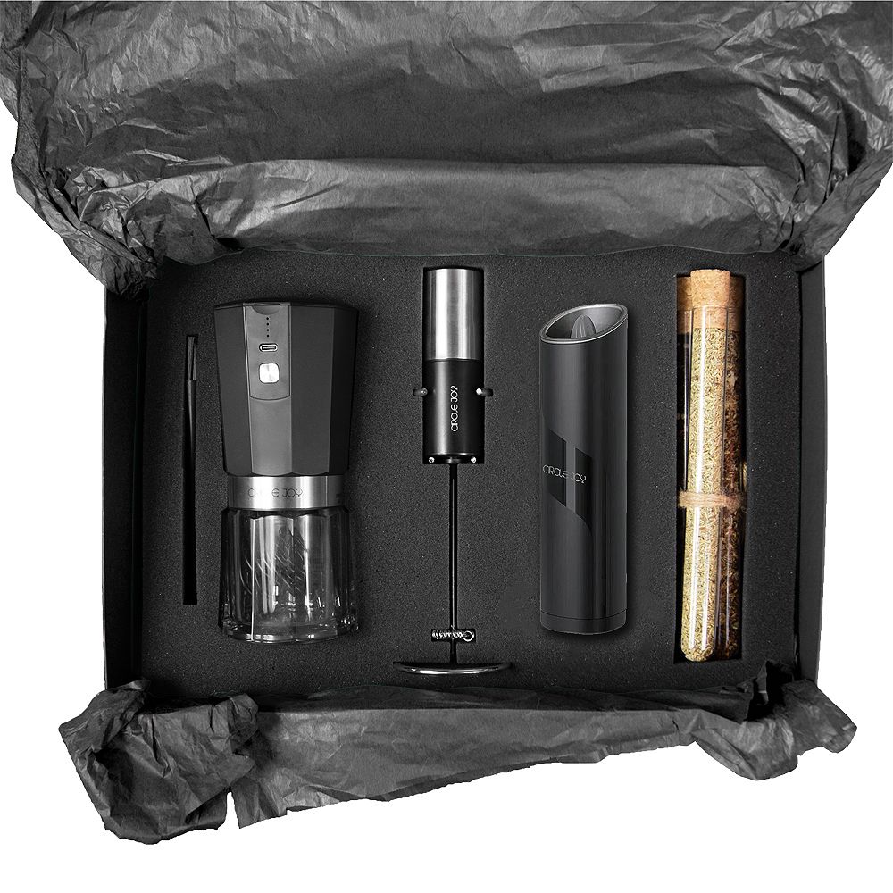 Цвет коробки может быть заменён по желанию заказчика. А так же мельница для кофе и вспениватель могут быть заменены на аналогичные, однако с золотыми элементами (арт. CJ-EG05 - мельница, арт. CJ-EMF05 - вспениватель).