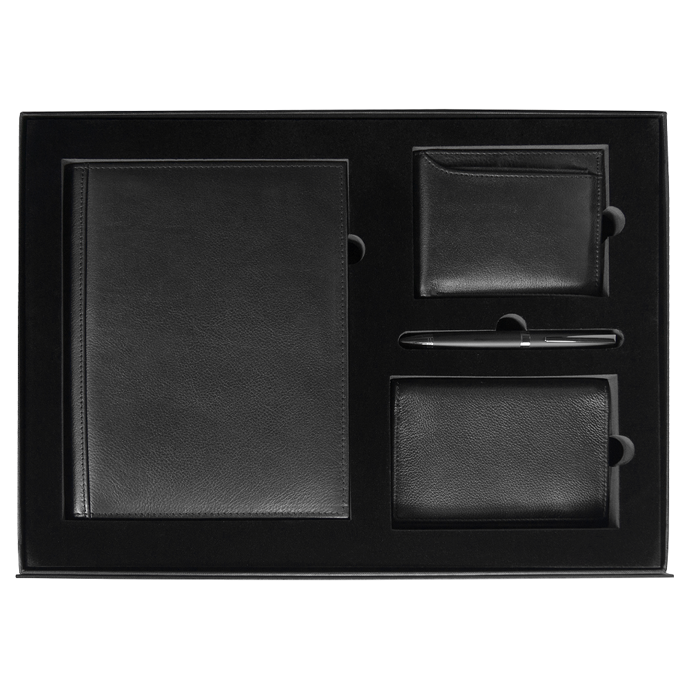 Стильный и утончённый подарок для тех, кто ценит премиальное качество и сдержанную элегантность. Чёрный цвет в сочетании с натуральной кожей и металлическими акцентами создаёт образ, который говорит о вкусе, статусе и внимании к деталям. Каждая составляющая набора гармонично дополняет другую, образуя функциональный ансамбль для делового и повседневного применения.