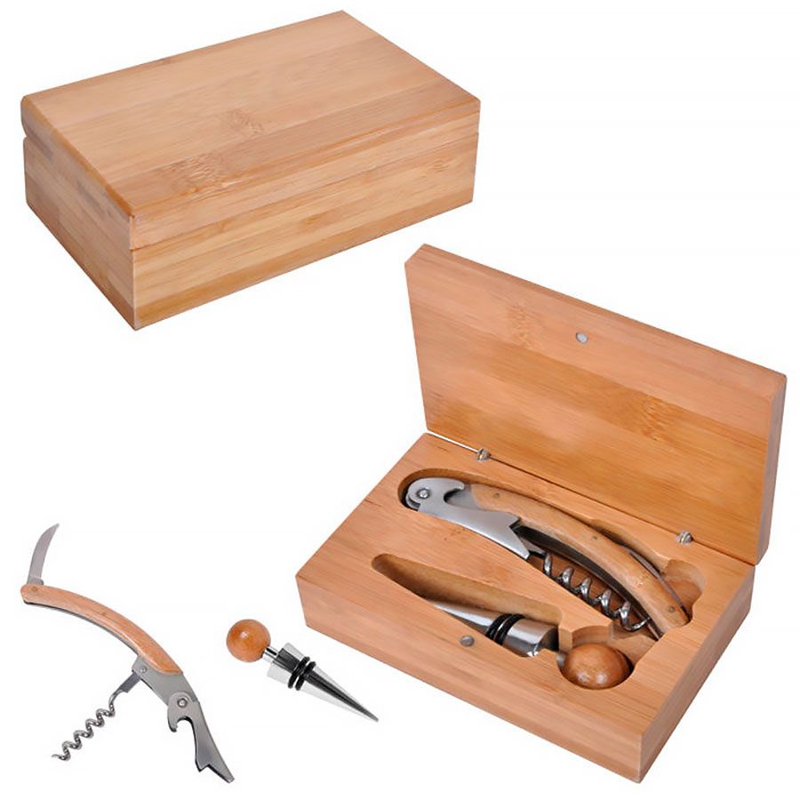 Набор для вина (2 предмета) В комплекте: нож сомелье со штопором, пробка Стильный набор для вина в коробочке из бамбука – одного из самых востребованных материалов для кухонных принадлежностей. В комплекте два самых необходимых предмета – нож со штопором и пробка. Благодаря этому благородному комплекту вино будет удобно как открыть, так и хранить, а надежный футляр из натурального материала с гравировкой будет смотреться просто великолепно! Предметы набора безопасны и гигиеничны в использовании, прослужат долго и станут доброй традицией не одного поколения. Достойный и востребованный подарок друзьям, коллегам, партнерам, клиентам, посетителям и гостям!