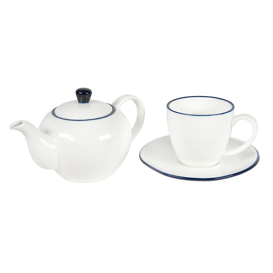 Набор выполнен в классическом нежном дизайне. Синий кант по верху изделий. Волнообразное покрытие чашки, похожее на рябь на поверхности воды и неровная форма блюдца отсылает нас к категории продуктов hand-made. Подарочная картонная коробка "крышка/дно".