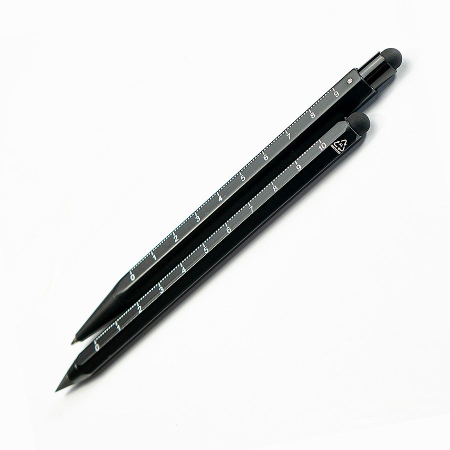 Карандаш вечный MASTER со стилусом и линейкой Вечный карандаш не требует заточки, не пачкает руки, на бумаге пишет мягко и без особых усилий в любых температурных условиях. Грифель служит около 25 лет.• Размер φ8x140 мм• Шестигранный корпус из переработанного алюминия• Значок переработки в верхней части корпуса• Грифель – сплав металла с графитом• Стирается обычным ластиком• Наличие шкал на линейке в сантиметрах• Оснащен стилусом• Виды нанесения: тампопечать, УФ печать, гравировка