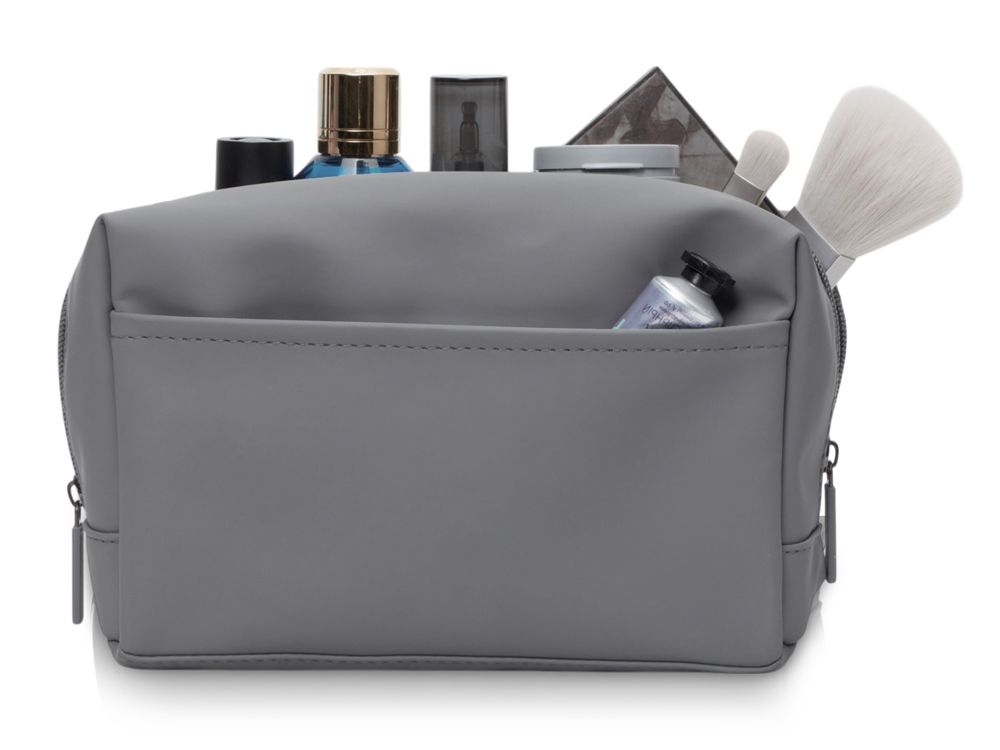 Вместительная и приятная на ощупь косметичка из экокожи с покрытием софт-тач - незаменимый спутник в любых поездках. В ней легко поместится вся необходимая уходовая или декоративная косметика и даже кисти. 2 отделения внутри и 1 снаружи помогут удобно разложить все любимые баночки и флакончики. Стильный серый цвет делает косметичку универсальным полем для логотипов любого цвета. - приятная поверхность софт-тач; - внутри дополнительные кармашки для мелочей; - удобный внешний карман.